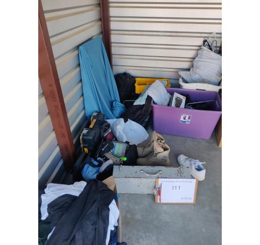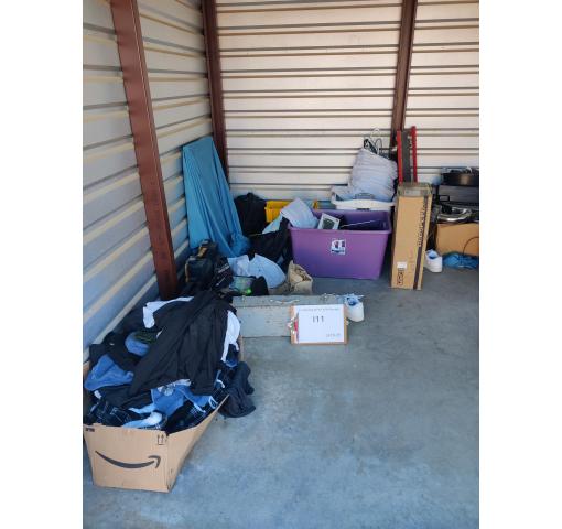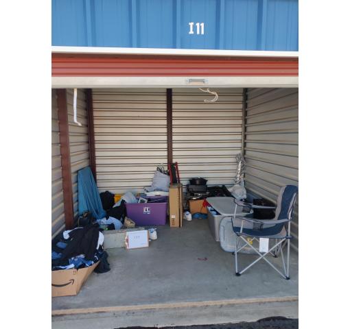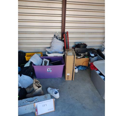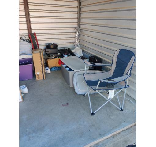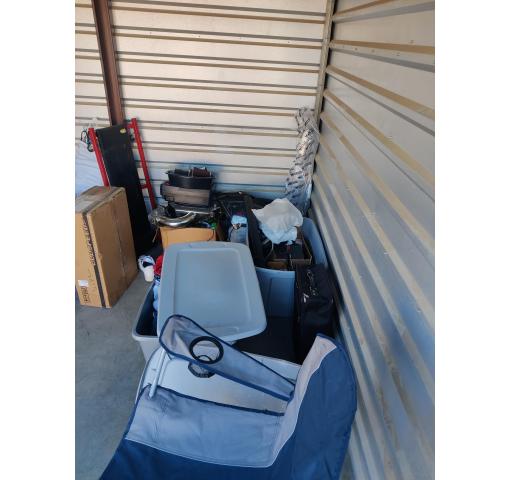 This 10 x 10 unit contains a creeper, lawn chair, totes and boxes of misc.