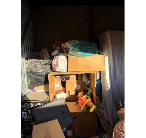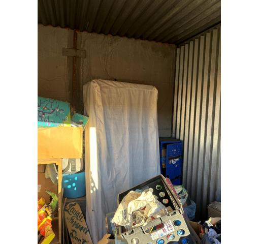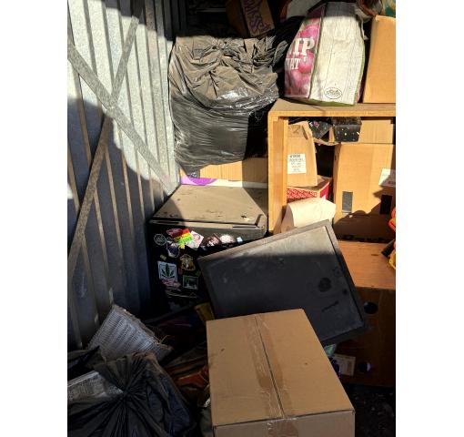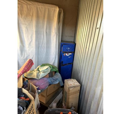 This is a 10 x 10 unit that appears to contain mini fridge, locker, furniture, bed and lots of misc.