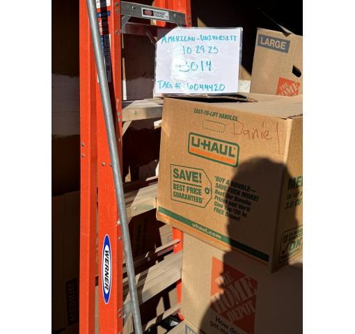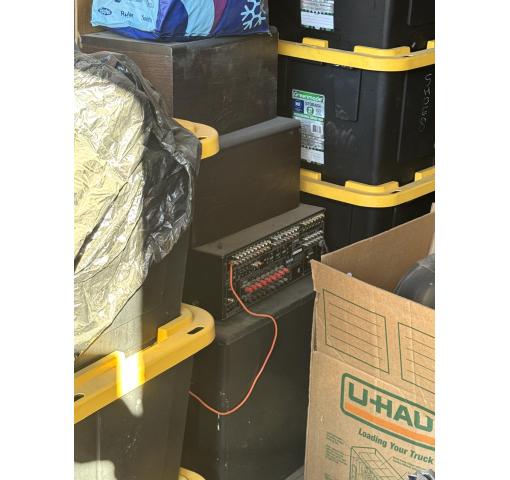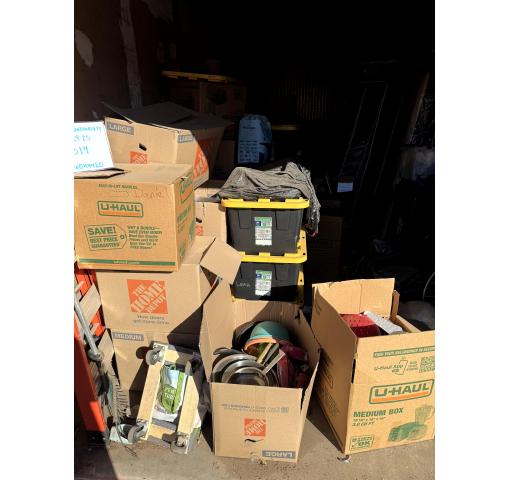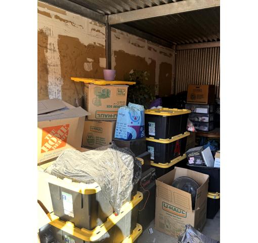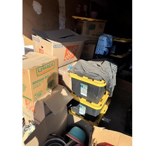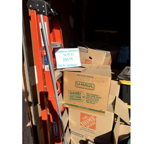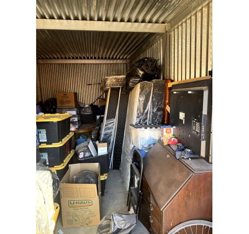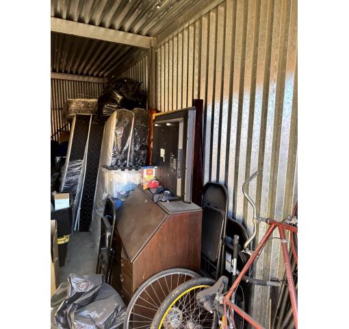 This is a 10 x 20 unit that appears to contain a ladder, dolly, bicycles, flat screen, desk, beds, table, electronics and many boxes and totes of misc.