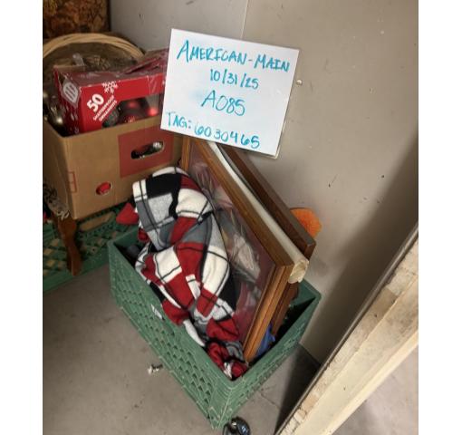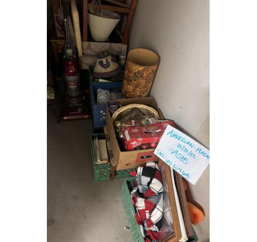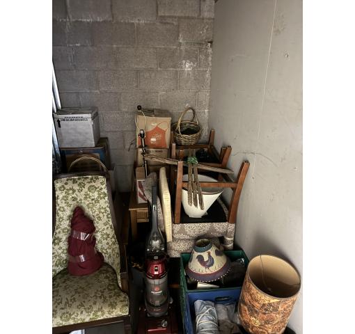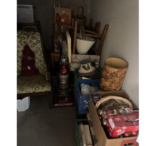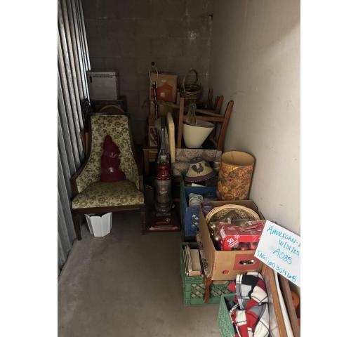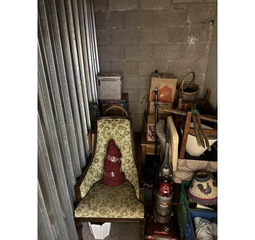 This is a 5 x 10 unit that appears to contain a chair, lamp, milkwires and boxes of misc.