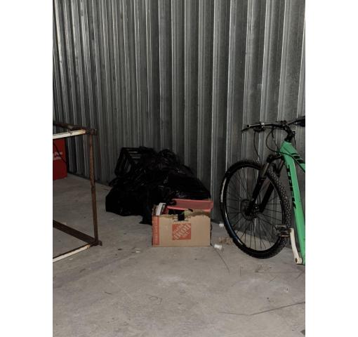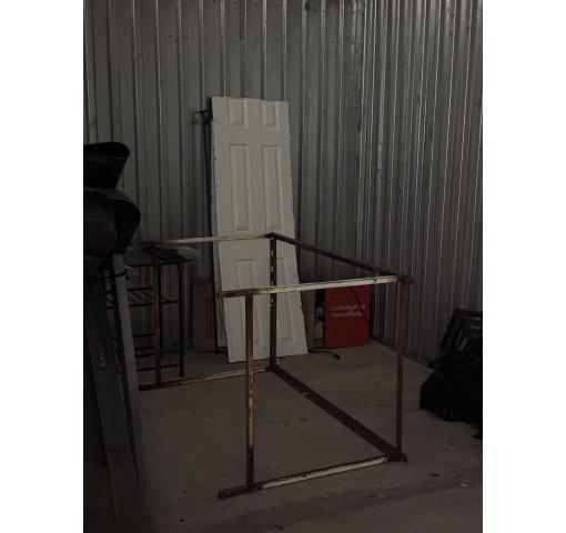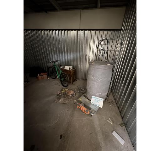 This is a 10 x 20 unit that appears to contain a bicycle, metal frame, barrel on dolly, door and boxes of misc.