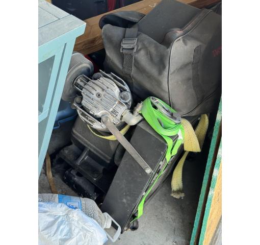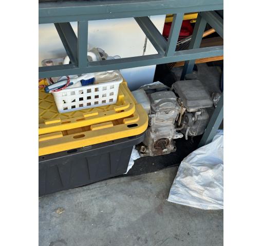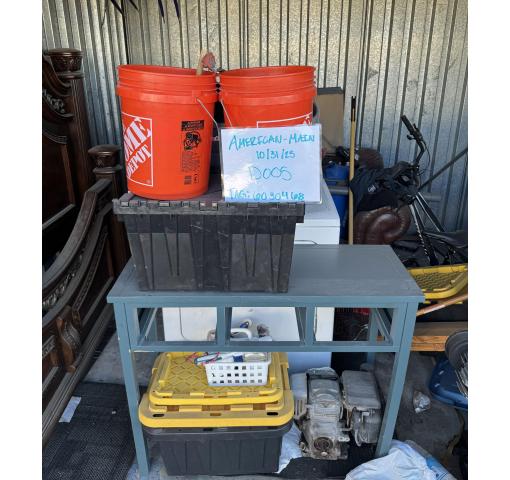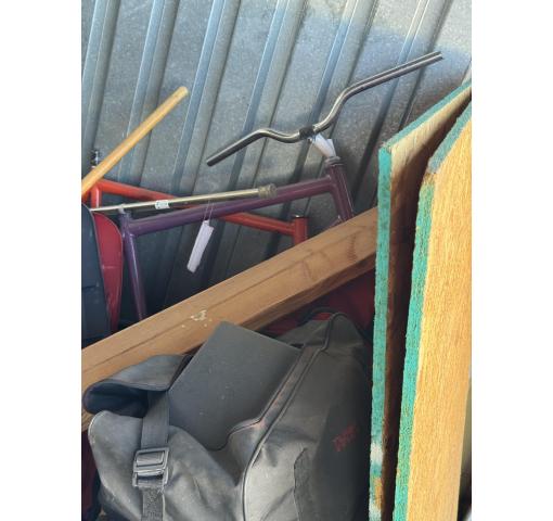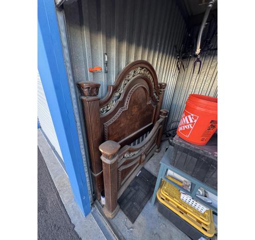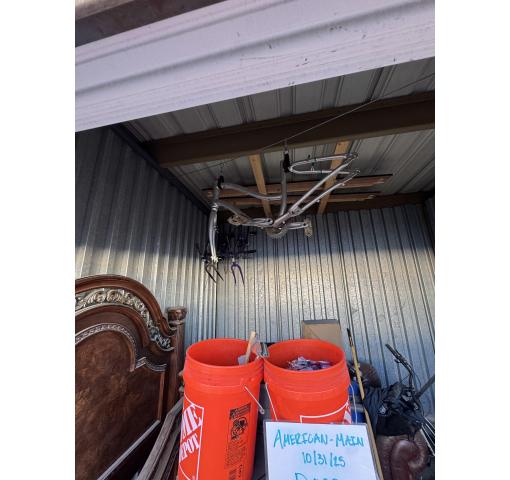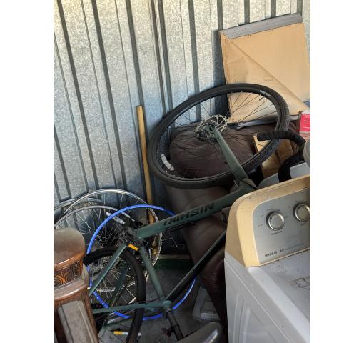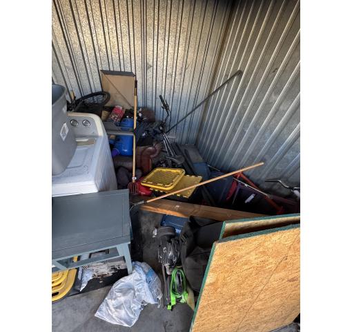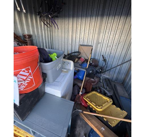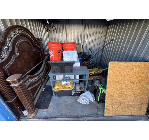 This is a 10 x 10 unit that appears to contain buckets, table, dryer, bed, plywood, bike frames, totes and boxes of misc.