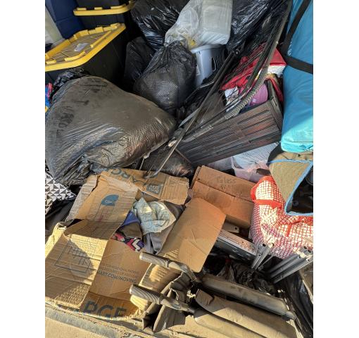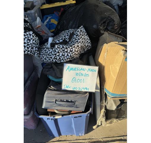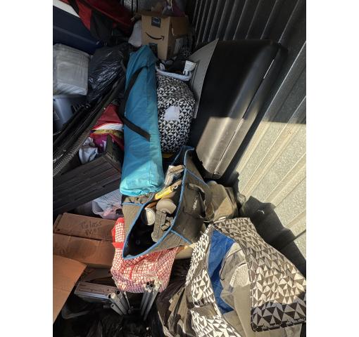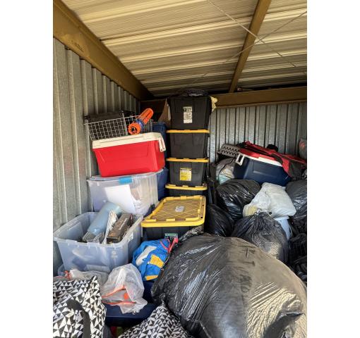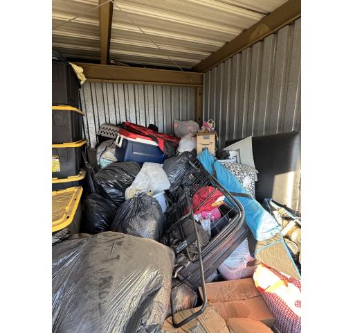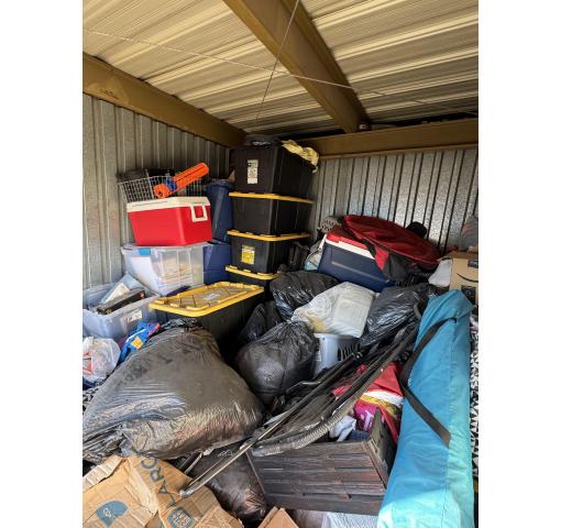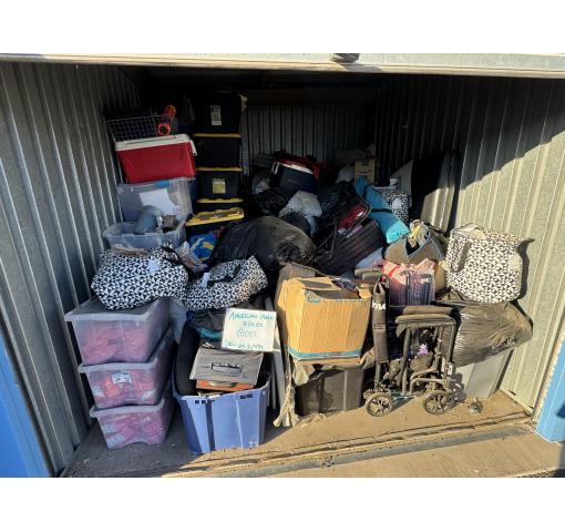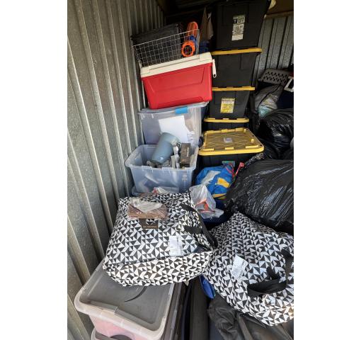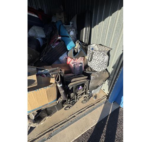 This is a 10 x10 unit that appears to contain a wheelchair, many bags, totes and boxes of misc.