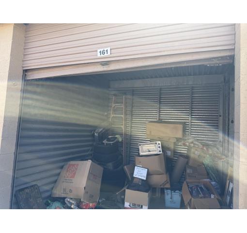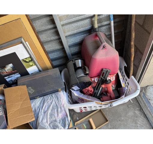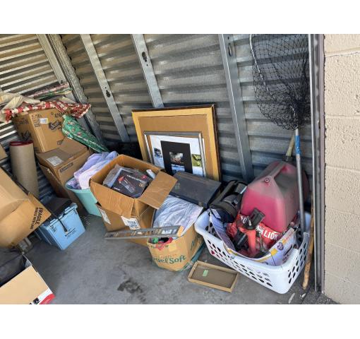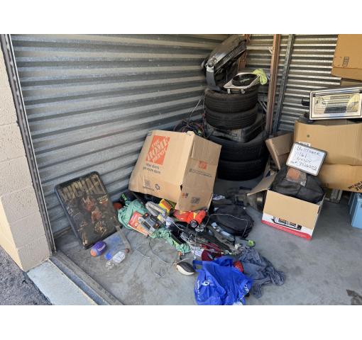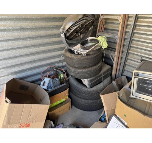 This is a 10x10 unit which appears to contain tires, Michael Jordan poster, gas, can, framed pictures, fan, toaster oven and boxes of misc.