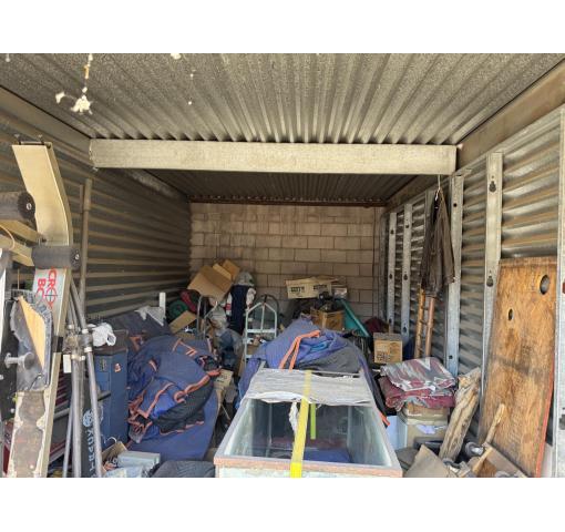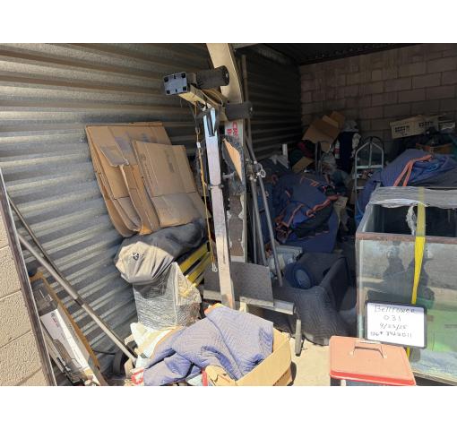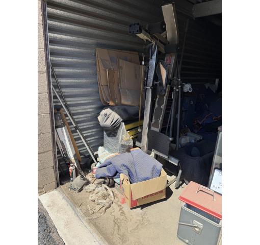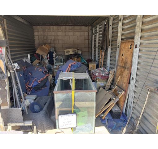 This is a 10x20 unit which appears to contain a cooler, aquarium?, lots of dollies, weight machine and lots of misc.
