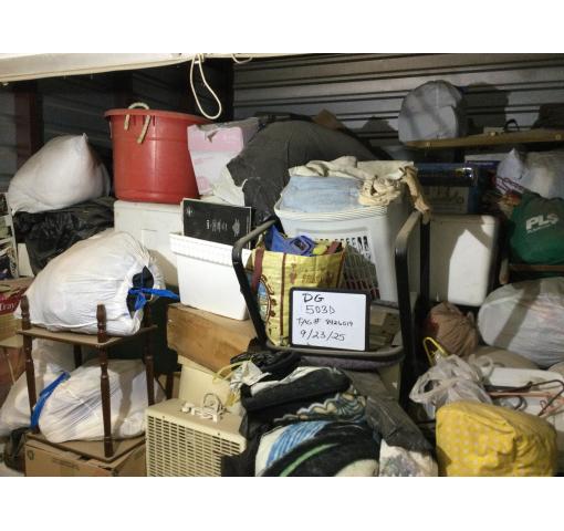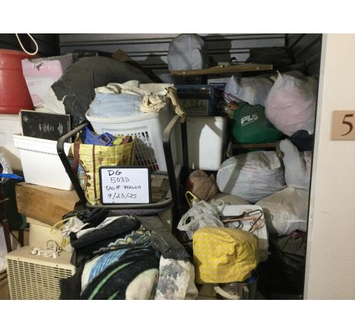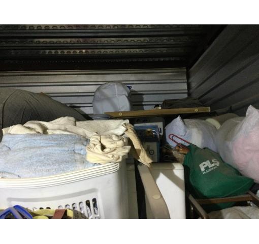 This is a 10x10 unit which appears to contain a fan, laundry basket, night stand, many bags and boxes of misc.