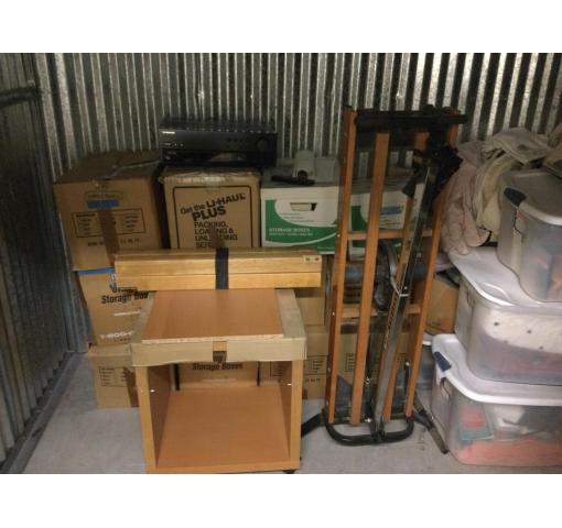 This unit is a 8x10 and contains a plastic storage, wood, lamp, Nordic-trac, boxes and totes of misc.