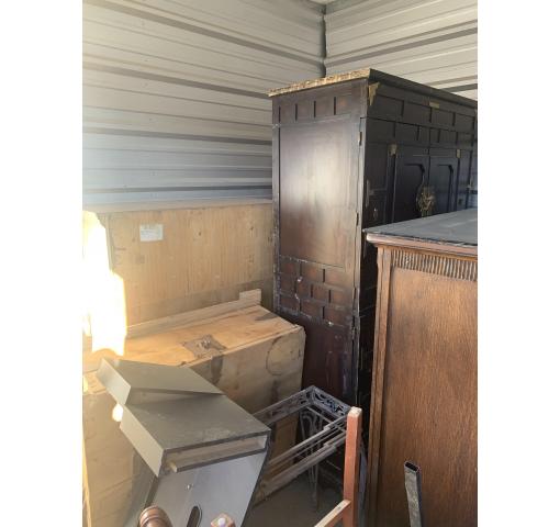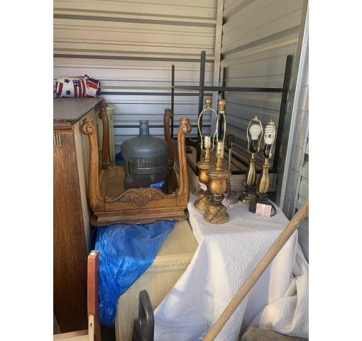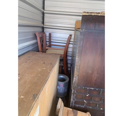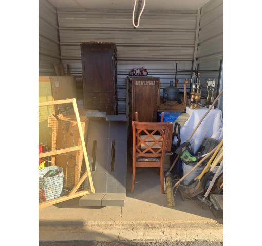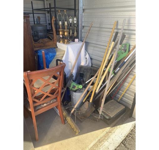 This is a 10x10 unit which appears to contain, DRESSERS(5), GARDEN TOOLS, LAMPS, WOODEN CHEST, CHAIRS, MISC ITEMS