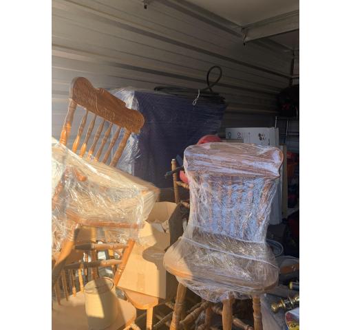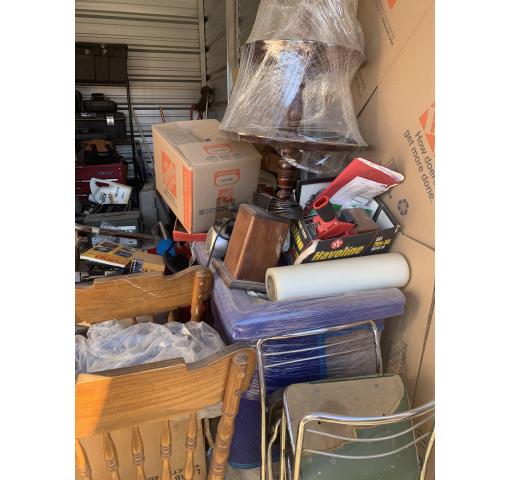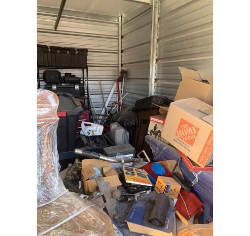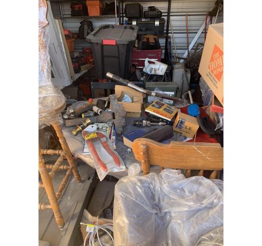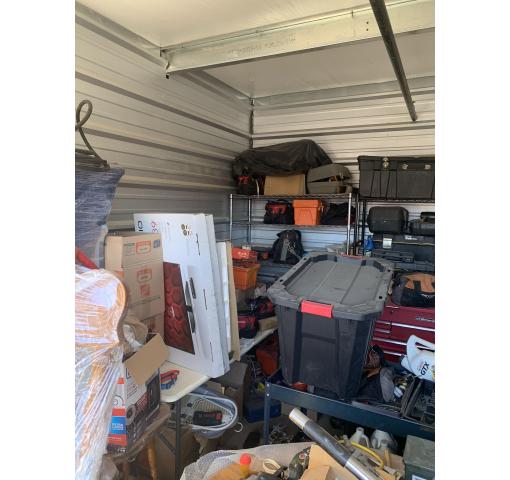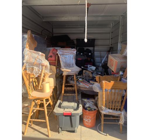 This is a 10x15 unit which appears to contain, BAR STOOLS, ARMOIRE, TOOLS & TOOL BOXES, TABLE, METAL RACKS, MISC ITEMS