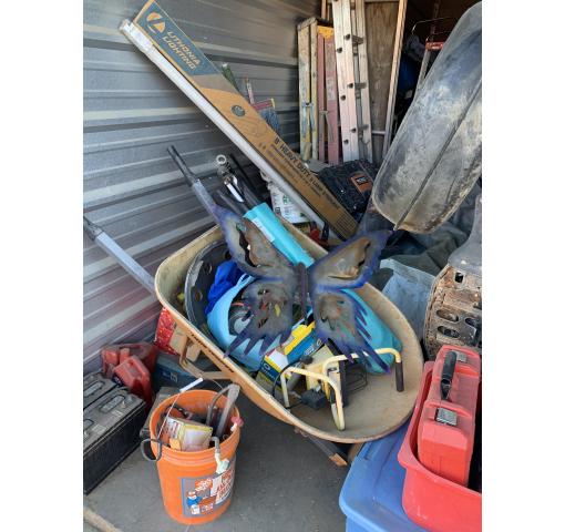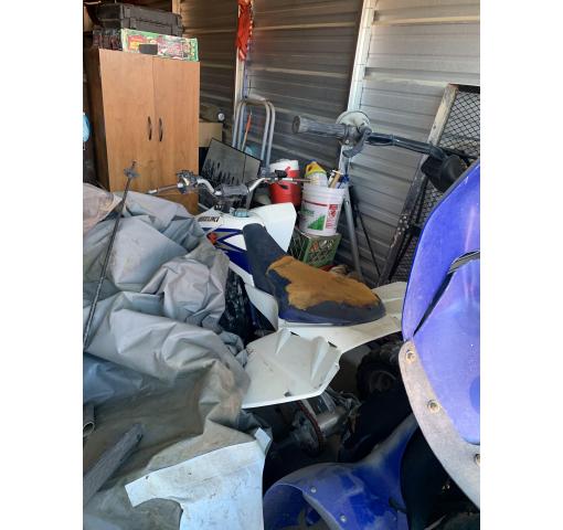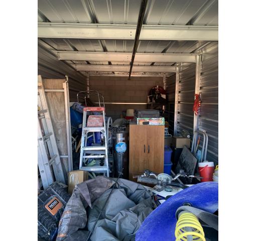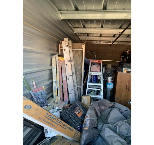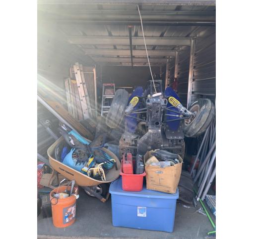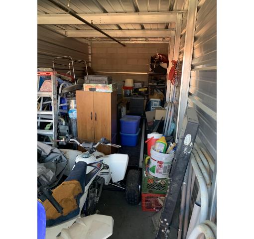 This is a 10x25 unit which appears to contain, SUZUKI QUAD RUNNER (PARTS),POLARIS TRAIL BLAZER (PARTS), LADDERS, TOOLS, WATER SOFTNER, MISC PLASTIC TOTES & CRATES, MISC ITEMS. Quads are parts only. No Declarations of sale will be issued.