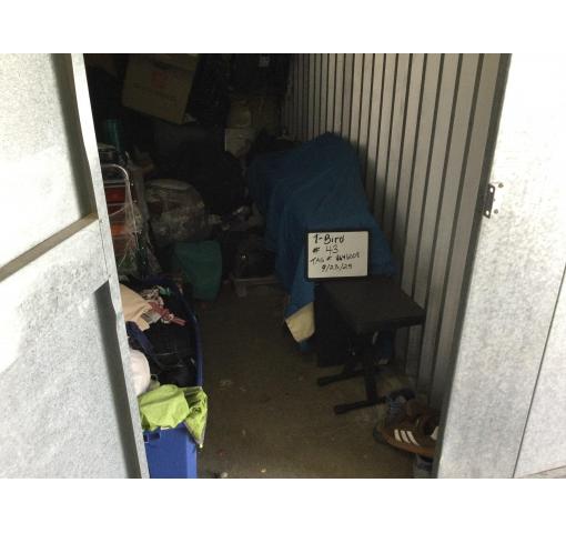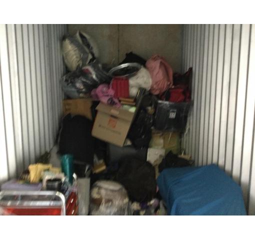 This unit is a 5 x 10 and contains a storage rack, shoes and boxes of misc.